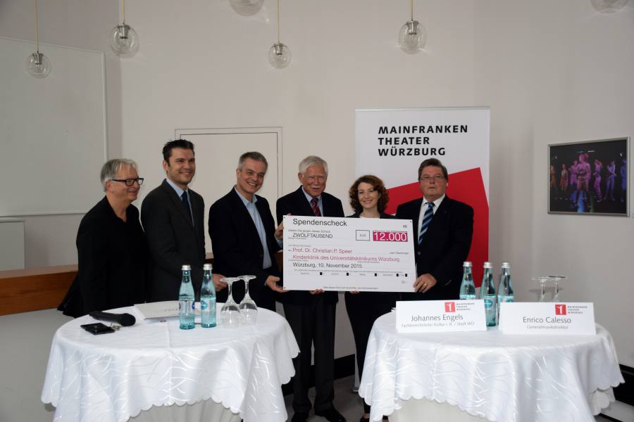 (V.l.n.r.) Johannes Engels (Fachbereichsleiter Kultur i. R. der Stadt Würzburg), Enrico Calesso (Generalmusikdirektor am Mainfranken Theater Würzburg), Dirk Terwey (Kaufmännischer Geschäftsführer des Mainfranken Theaters Würzburg), Prof. Dr. Christian P. Speer (Direktor der Kinderklinik des Universitätsklinikums Würzburg), Dr. Kirsten Glaser (Oberärztin der Kinderklinik des Universitätsklinikums Würzburg) und Dr. Adolf Bauer (Bürgermeister der Stadt Würzburg). Foto: Mainfranken Theater Würzburg