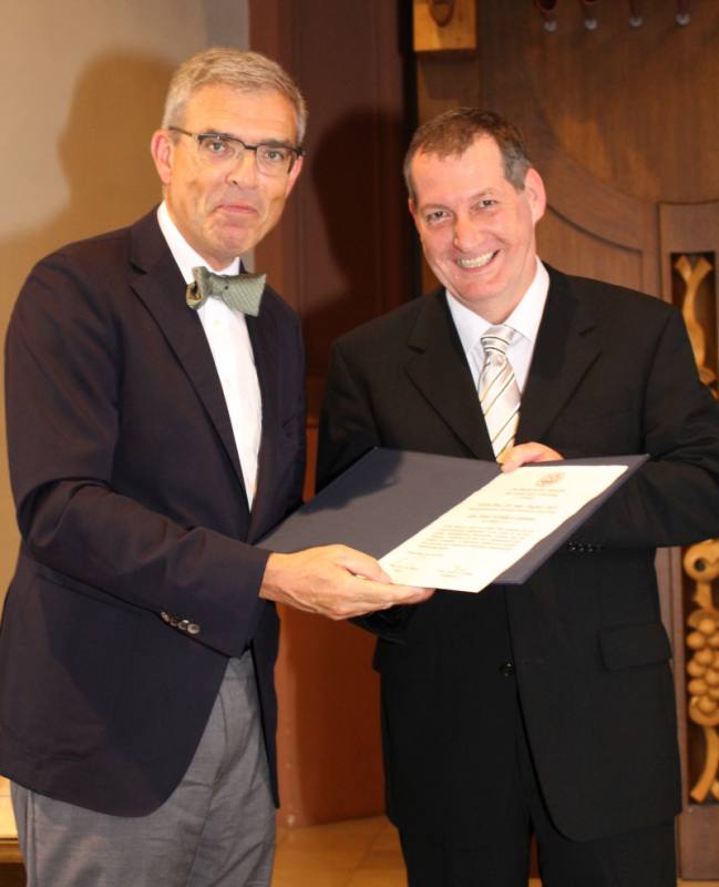 Im Rahmen der Examensfeier der Medizinischen Fakultät am 04.07.2015 wird Herrn Prof. Dr. August Stich (rechts) der Albert-Kölliker-Lehrpreis von Herrn Prof. Dr. Frosch (links), Dekan der Medizinischen Fakultät, verliehen. Foto: Medizinische Fakultät
