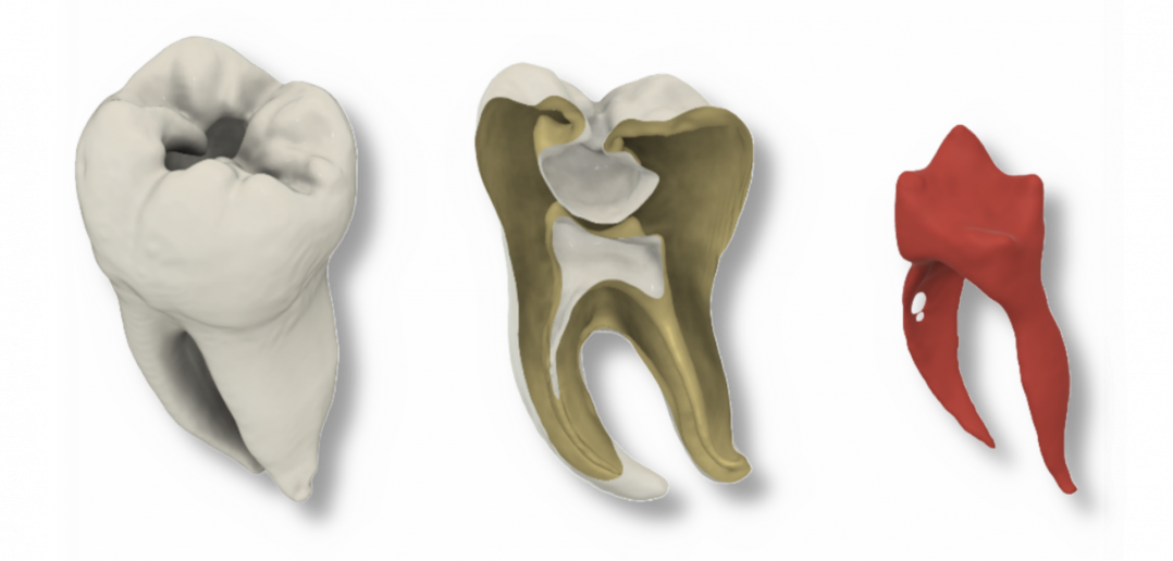 Rekonstruktion eines echten Zahnes basierend auf einer Mikro-CT-Aufnahme; v.l.n.r. Übersicht des ganzen Zahnes, Querschnitt des Zahnes; Wurzelkanäle und Pulpa. Bild: Christian Höhne / UKW