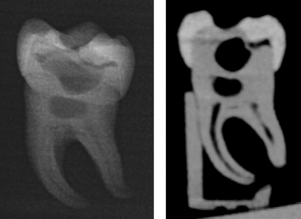 Der gedruckte Zahn besitzt ein realistisches Röntgenverhalten. Links Aussehen des Zahnes bei einem Zahnfilm mit allen erkennbaren Innenstrukturen und rechts bei einer dreidimensionalen Röntgenaufnahme in Form eines so genannten DVT´s. Bild: Christian Höhne / UKW