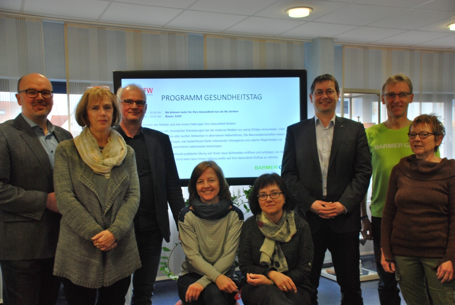 Auf dem Bild von links: Leiter Administration Thomas Abersfelder, die BFW Betriebsratsmitglieder Hiltrud Müllen-Höhlriegel, Michael Tiedemann, Ute Romeis, Elke Bock. BFW Geschäftsführer Christoph Wutz, Dietmar Werner (Barmer GEK) und Betriebsrätin Doris Ruprecht. Auf dem Bild fehlen die Betriebsratsmitglieder und Organisatoren Beate Ströhlein, Jürgen Heusler.