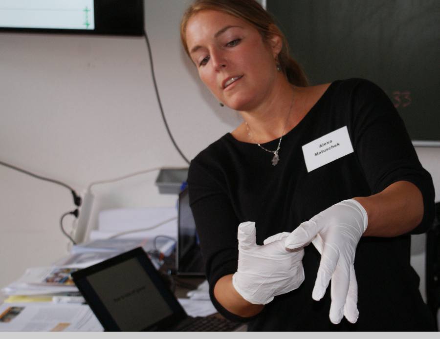 Alexa Matuschek demonstriert beim Trainingsworkshop den GIZ-Teilnehmern das fachgemäße Ausziehen von Schutzhandschuhen. Foto: Elke Blüml/Missionsärztliches Institut SONY DSC 0 am 6. Oktober 2015 Share. Twitter Facebook Pinterest LinkedIn Tumblr Email