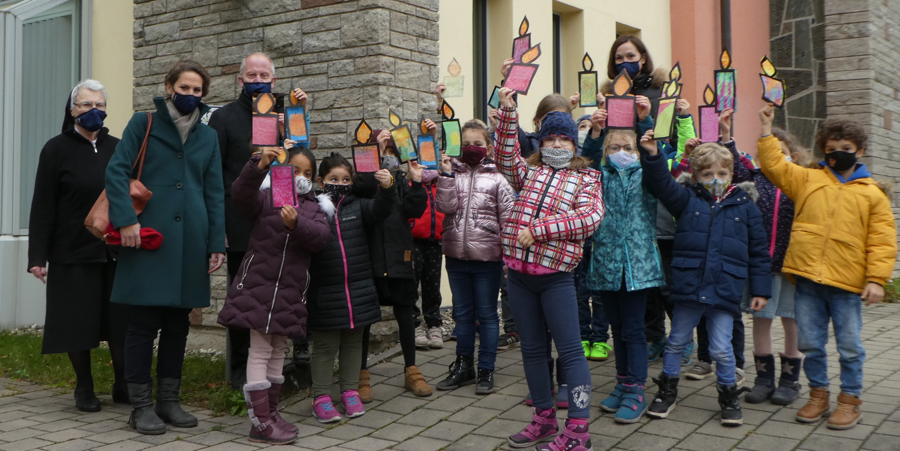 Die Kinder bastelten Kerzen, aber keine, die man anzündet, sondern solche, die man ans Fenster hängt und die durch ihre Farben erfreuen. „Die Kinder haben Butterbrotpapier mit bunten Wachsmalkreiden bemalt“, erzählt die Rektorin. Wird das Ganze dann gefaltet und gebügelt verlaufen die Farben ineinander und es entstehen wunderschöne farbenfrohe Muster.