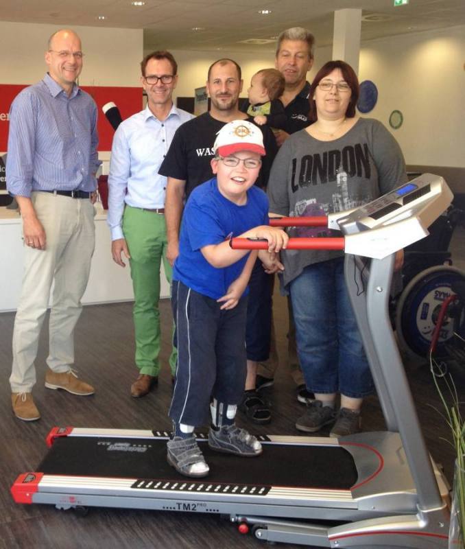 Constantin Carl (Gründungsmitglied Verein "Brücken bauen" und Geschäftsführer HAAS Holding GmbH), HAAS-Geschäftsführer Jürgen Czalla, Vater Sven mit Sohn Nick, Gerhard Endres (Fachmann für Individual-Reha bei HAAS), Mutter Monika Semmel und Sohn Fabian. (V. l. n. r.) . Foto: Jenifer Gabel