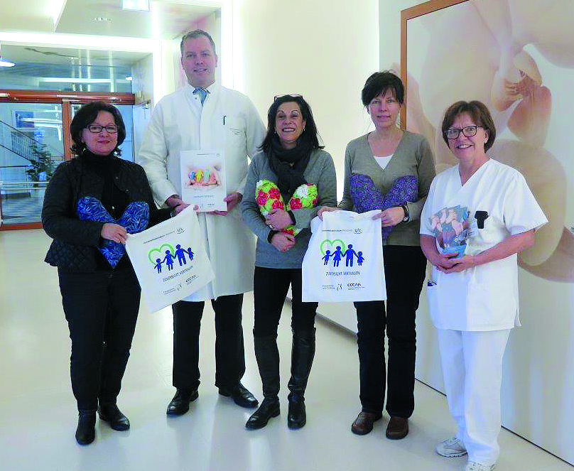 Präsentieren die neue Patientinnen-Informationstasche und die Herzkissen (v. l.) : Beate Beyrich (Frauenselbsthilfe nach Krebs e.V.), Prof. Achim Wöckel (Würzburger Universitätsfrauenklinik), Gabriele Nelkenstock (Hilfe im Kampf gegen Krebs e.V.), Brigitte Keller (Frauenselbsthilfe nach Krebs e.V.) und Johanna Schlereth (Würzburger Universitätsfrauenklinik).