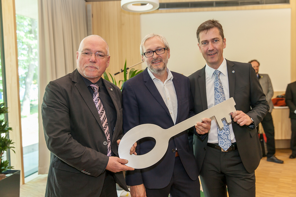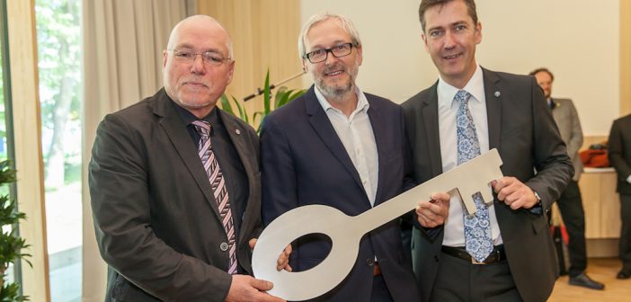 Der barrierefreie Ausbau, multifunktional nutzbare Räume, sowie die harmonischen Übergänge zwischen Gebäude und der Außenanlage Bastion ermögliche laut Schuchardt fast jedes Veranstaltungsformat. Bereits am 24. und 25. Mai dürften an einem Wochenende mit Fair-Trade-Festival und einem Tag der Offenen Tür viele Register gezogen werden. Große Glasflächen bringen Licht ins Innere des Gebäu-des, indem auch ein Baum Wurzeln schlägt. Schlanke Holzstäbe sind neben den Betonwänden optisch prägend und ebenfalls ein verbindendendes Element zur grünen Umgebung. Architekt Franz Balda erläuterte das Konzept des zweistöckigen Gebäudes, das aufgrund der Topographie aus vielen Blickwinkeln nicht die Höhenwirkung entfacht, die man am Haupteingang wahrnimmt. „In zwei Jahren Bauzeit (Hochbau) entstand mit 30 involvierten Firmen ein echter Prototyp. Dank des Bauherrn nicht die erstbeste, sondern die beste Lösung“, gab der Architekt das große Lob zurück, dass er zuvor von vielen Seiten erfahren hatte.
