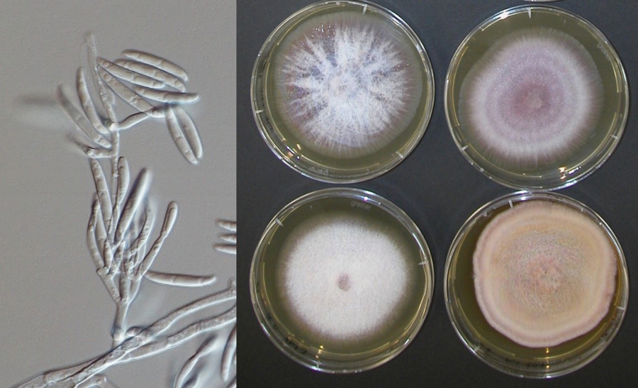 Ein Schimmelpilz der Gattung Fusarium unter dem Mikroskop (links) und in Laborkulturen. Fusarium ist einer der wichtigsten Erreger der Pilzkeratitis. Foto: Nationales Referenzzentrum für Invasive Pilzinfektionen