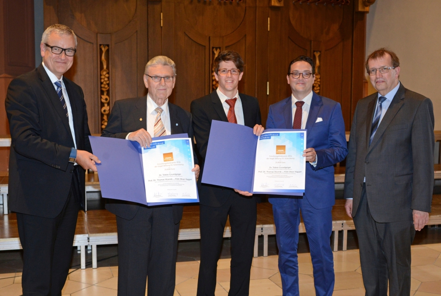 Übergabe des Forschungsförderpreises 2016 (v.li.): David Brandstätter (Vorsitzender Universitätsbund), Dr. Kurt Eckernkamp (Stifter Vogel Stiftung), Dr. Tobias Grundgeiger und Oliver Happel (Preisträger, nicht im Bild: Prof. Dr. Thomas Wurmb), Prof. Dr. Alfred Forchel (Präsident Universität Würzburg). Foto: Untch/Vogel Business Media